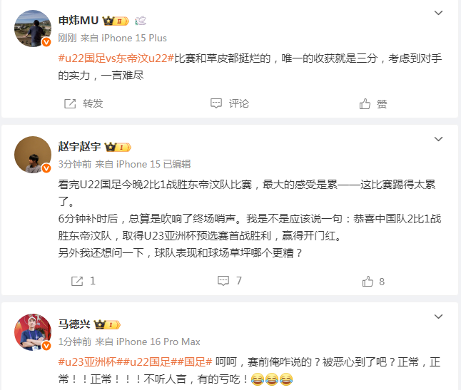 媒体人赵宇则认为,这场比赛难以分清草皮和中国队表现谁更差,“看完U22国足今晚2比1战胜东帝汶队比赛,最大的感受是累——这比赛踢得太累了。6分钟补时后,总算是吹响了终场哨声。我是不是应该说一句:恭喜中国队2比1战胜东帝汶队,取得U23亚洲杯预选赛首战胜利,赢得开门红。另外我还想问一下,球队表现和球场草坪哪个更糟?”