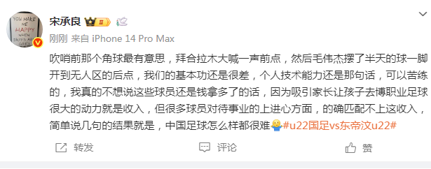 媒体人宋承良则指出,很多中国球员缺乏上进心,“吹哨前那个角球最有意思,拜合拉木大喊一声前点,然后毛伟杰摆了半天的球一脚开到无人区的后点,我们的基本功还是很差,个人技术能力还是那句话,可以苦练的,我真的不想说这些球员还是钱拿多了的话,因为吸引家长让孩子去博职业足球很大的动力就是收入,但很多球员对待事业的上进心方面,的确匹配不上这收入,简单说几句的结果就是,中国足球怎么样都很难。”
