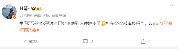 媒体人甘慧则表示,没想到中国足球沦落到这个地步,“中国足球的水平怎么已经沦落到这种地步了,打东帝汶都旗鼓相当。哎!”